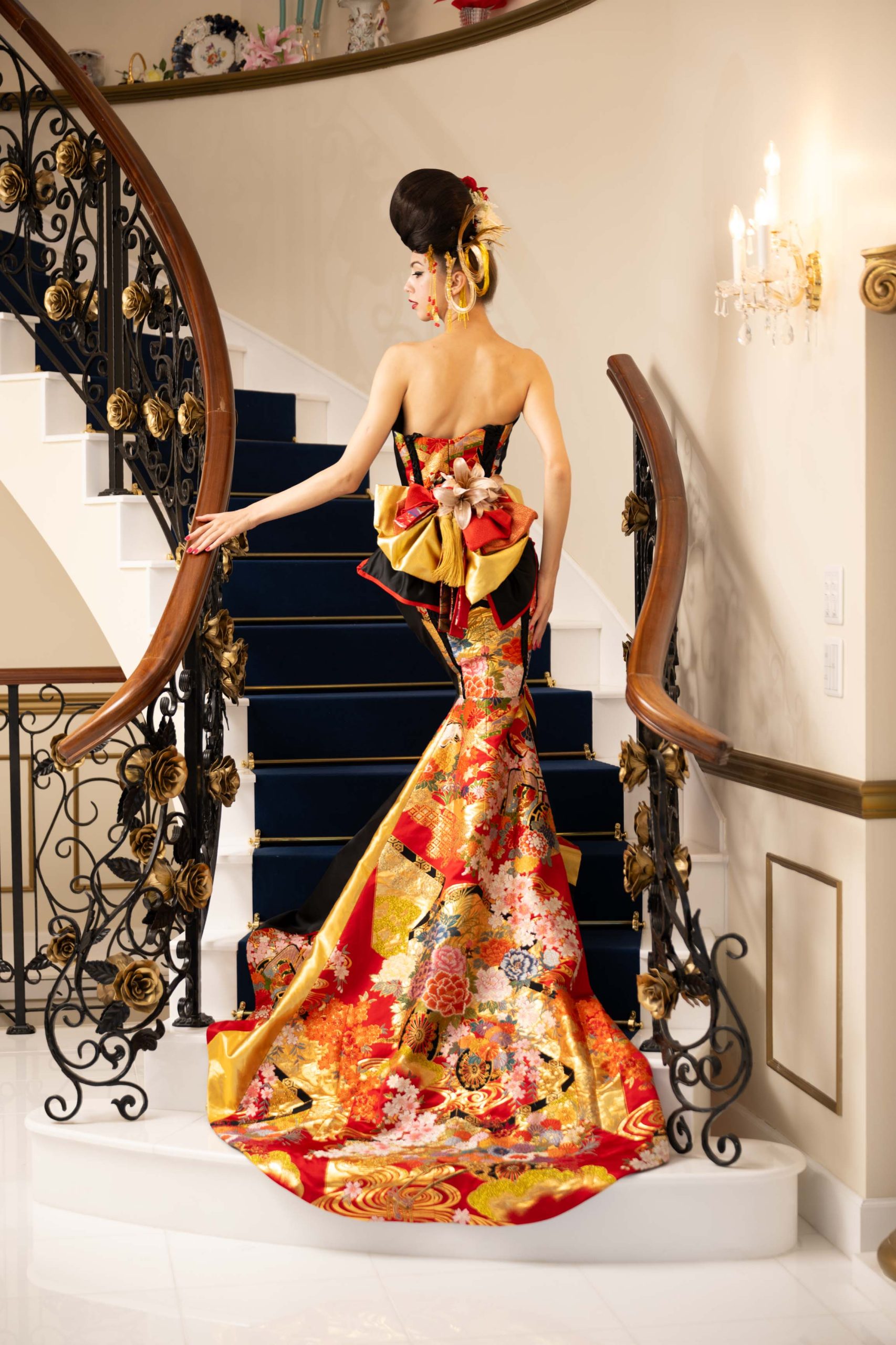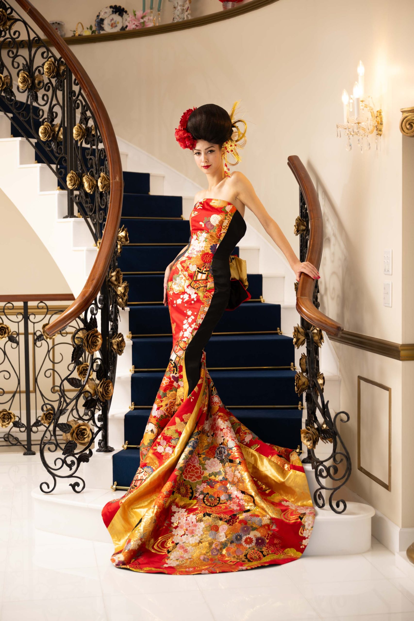 エネルギーに満ちた赤と金のコンビネーションが、着る人の存在感を女王のように堂々と輝かせます。